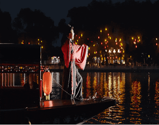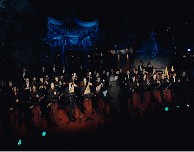 泛舟湖上,舳艫蔽水,一曲唱罷,余韻繞梁。隨著演員們身著古裝乘船從水面緩行而來,吟唱古老的開河號子,恢弘的序曲《開河》奏響。開河節,這一漕運通船前的古老儀式,在音樂中被演繹得神秘悠遠且富有儀式感。音樂由靜到動,由弱至強,仿佛將聽眾帶回到那個運河逐漸繁忙興盛的年代。