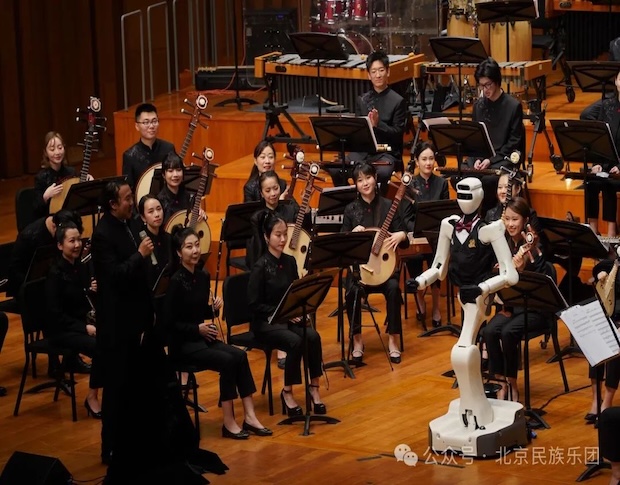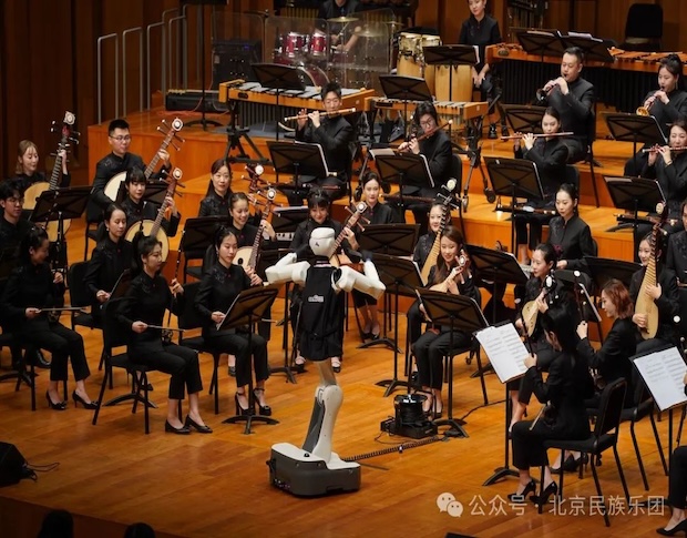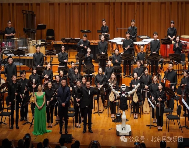 本場音樂會中,北京民族樂團特別聯合中央廣播電視總臺央視網,共同打造“科技”單元——返場特別節目《世間始終您好》。 在與樂團攜手合作中,機器人指揮不僅可以把握樂隊節奏,并在流動的樂聲中,與觀眾進行了互動,體現了AI智能技術機器人現代化進程的發展速度,從“千人一面,邁向千人千面”這重要的一步,這也是小央機器人指揮首次登上大劇院舞臺,為本場音樂會的舞臺增添了一縷科技之光。此前,演出策劃階段,樂團專業指揮團隊為機器人“賦藝訓練”,讓科技真正服務于藝術表達,體現了“科技激活傳統”的新探索。
