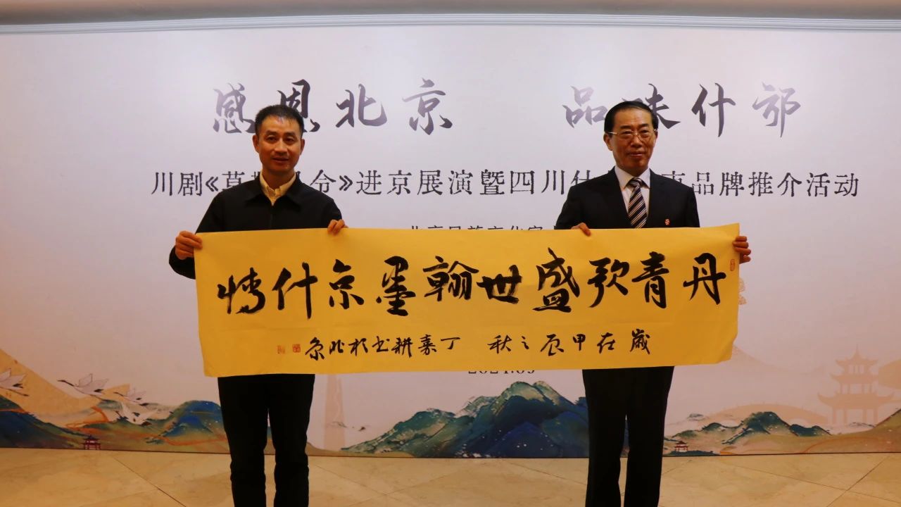 活動現場,草鞋縣令劇組演員化身“什邡文旅推介官”,用“川腔川韻”向觀眾推薦了“雪茄之都 精致之城”的城市風采。素有書法之鄉的什邡,邀請北京市 書法家協會副主席、北京市文聯理事丁嘉耕聯袂什邡書法家冷玉成現場揮毫潑墨 共同書寫了“丹青歌盛世 翰墨京什情”等作品,祝福家國安寧,寄情京什友誼;《煙火什邡》主題曲與川劇變臉的融合演繹,“什邡造”好物長城雪茄、唯怡飲品、什邡泡菜、帥大娘牛肉餅等特色產品的現場派送,點燃了大家對什邡“煙火氣”的無限向往