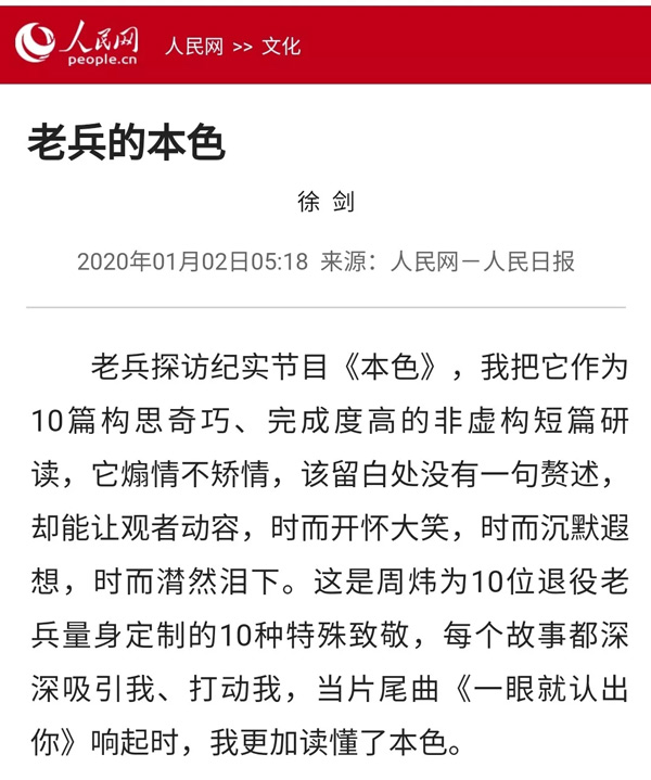 探尋綠色背影,致敬本色人生。作為國內首檔老兵探訪紀實節目的《本色》,我并沒有把它等同為一般的系列專題節目來看,而是作為十篇構思奇巧、完成度高的非虛構短篇來研讀,我欣喜地看到,周煒借助電視藝術的綜合手段,彌補或者說超越了文字文本的所有不足,煽情不矯情,該留白處沒有一句多余的贅述,卻能讓觀者動容,緊跟他的敘事節奏,時而開懷大笑,時而沉默遐想,時而潸然淚下。這是周煒惜別綠色軍營后的轉型力作,他為十位退役老兵量身定制了十種特殊的致敬方式,每個故事都深深地吸引我、打動我,當片尾曲《一眼就認出你》響起時,我更加讀懂了周煒。