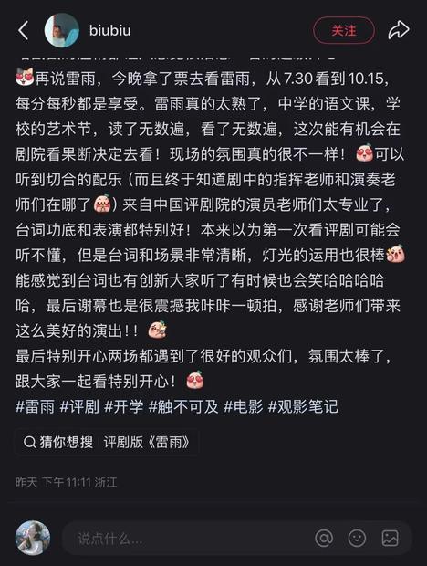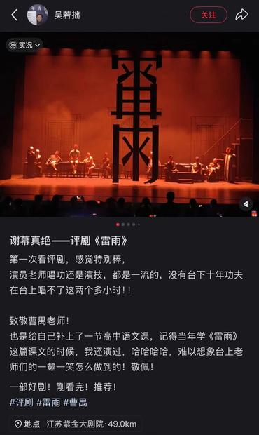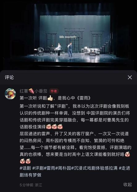 令人驚喜的是,兩場演出臺下還出現了許多朝氣蓬勃的年輕面孔,來自北京航空航天大學杭州國際校園的中外大學生們也在滿臺生輝的精彩表演中完成了對評劇藝術的劇場初體驗。他們將對評劇《雷雨》的喜愛化為謝幕時長達3分鐘雷鳴般的掌聲,將對演員們的喜愛定格在一張溢出舞臺的雙向奔赴的合影中。
