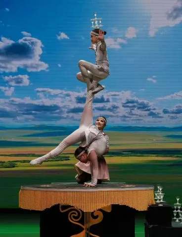 《天邊的光·滾杯》將遼闊草原的美好意象注入雜技表演,演員以身體為畫筆,在滾杯疊摞中勾勒出“牛羊散漫落日下, 野草生香乳酪甜”的壯美畫卷。