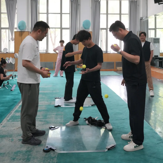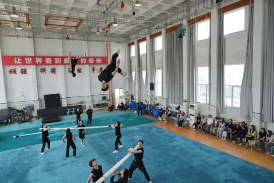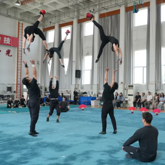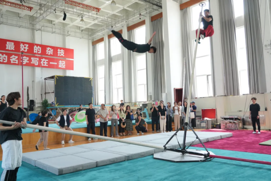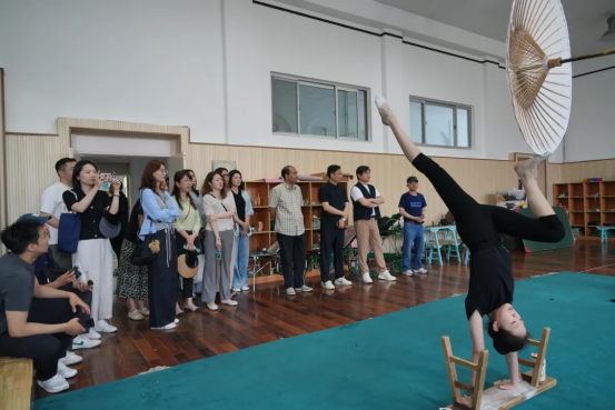 隨后,調研團隊深入專業樓,觀摩了雜技學員的日常訓練展示,并積極參與到球技、空竹、轉碟等雜技項目的互動體驗中。在東西訓練廳,調研團隊欣賞了中國雜技團的經典與創新節目,《騰韻·頂碗》展現了演員們卓越的平衡技巧與藝術表現力,《俏花旦·空竹》將傳統戲曲元素與空竹技藝巧妙結合,洋溢著靈動與美感,《掛云帆—抖杠》則以驚險刺激的動作和默契的團隊協作,贏得了現場觀眾的熱烈掌聲。通過近距離的觀賞和體驗,調研人員深刻感受到了演員們精湛的技藝和卓越的綜合素質,進一步認識到“團校一體”模式的豐碩成果,對中國雜技藝術的新時代水平有了更加直觀的感受。